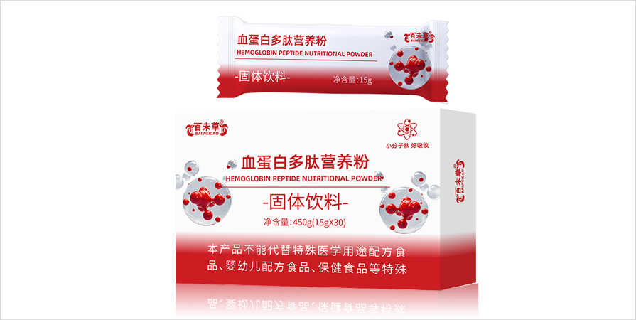 本品主要添加血红蛋白肽、脱脂乳粉、大豆分离蛋白、低聚果糖、低聚半乳糖、复合维生素(B1、B2、B6、B12、C、E)、矿物质(铁、锌、硒)、甜菊糖苷等主要原料,采用现代工艺合理配比精制而成
